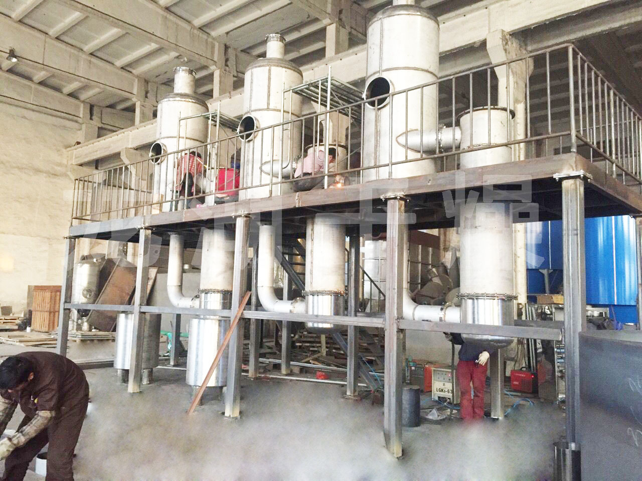 張家港某公司金屬清洗廢水使用現(xiàn)場,蒸發(fā)量每小時200kg,雙效蒸發(fā)器,配備電加熱蒸汽發(fā)生器